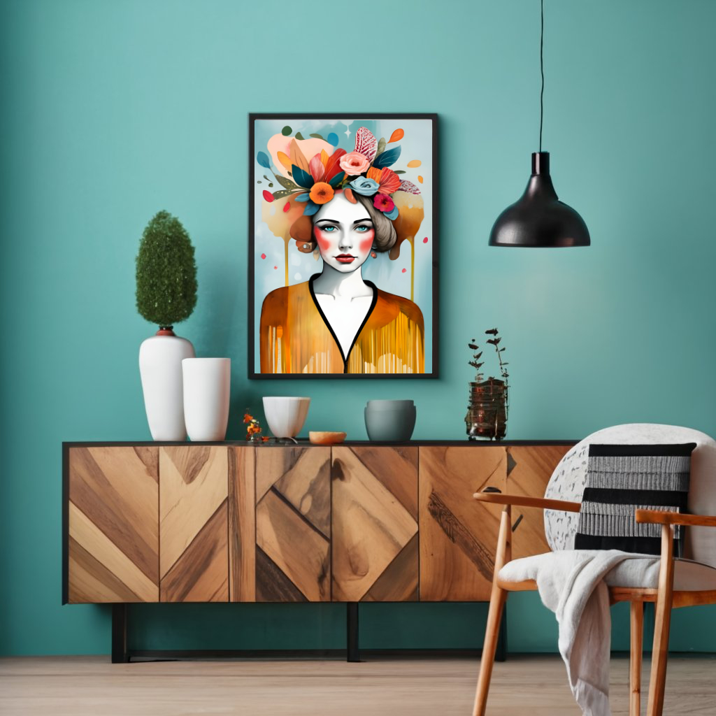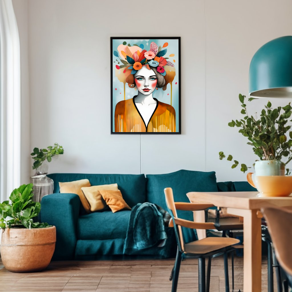 Frauenkopf mit Blumen im Haar, Boho Kunstdruck zum Download. Schöne Wall Art im Boho Stil für Zuhause oder Büro