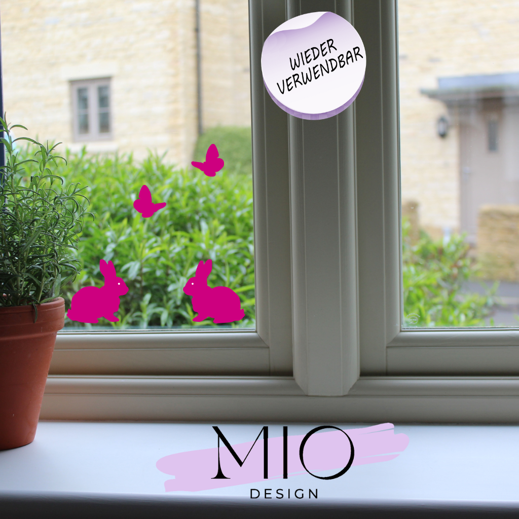 Wiederverwendbares Fensterbild als Osterdekoration oder Frühlingsdekoration. Du kannst alles ganz nach deinem Geschmack anordnen. Das Bild besteht aus 2 Osterhasen und 2 Schmetterlingen.