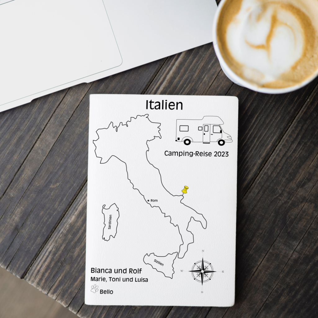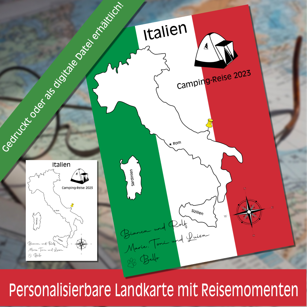 Du kannst das Jahr der Reise, die teilnehmenden Personen (und Tiere) eintragen lassen, das Campingfahrzeug und die passende Schriftart aussuchen. Wenn du eine Tour durch Italien gemacht hast, dann kann ich für dich alle bedeutenden Reisespots eintragen und auf Wunsch mit einer Linie in der Karte deutlich machen. Du warst nur an einem Ort? Dann trage ich dir diesen Ort ein und kennzeichne diesen mit einem Pin. Was genau du alles anpassen lassen kannst, siehst du in den Bildern.