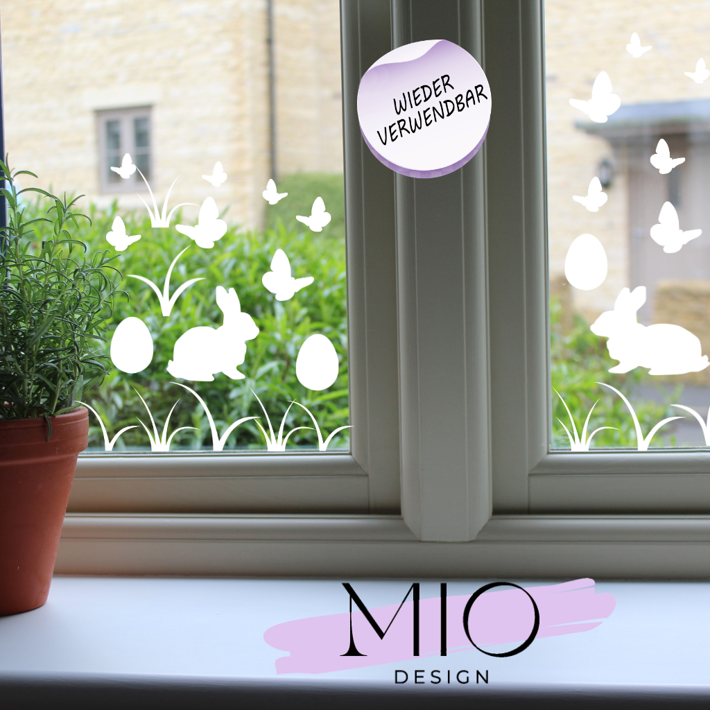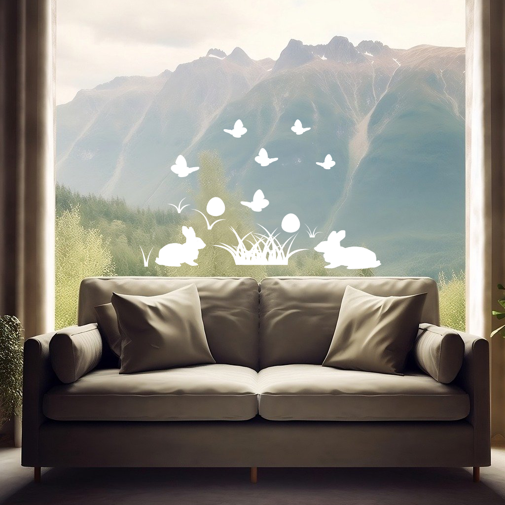 Wiederverwendbare Fensterbilder mit Osterhasen, Schmetterlingen und Gras. Frühlingsdeko