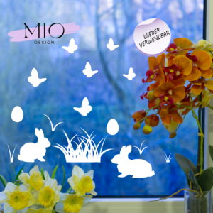 Wiederverwendbare Fensterbilder mit Osterhasen, Schmetterlingen und Gras. Frühlingsdeko